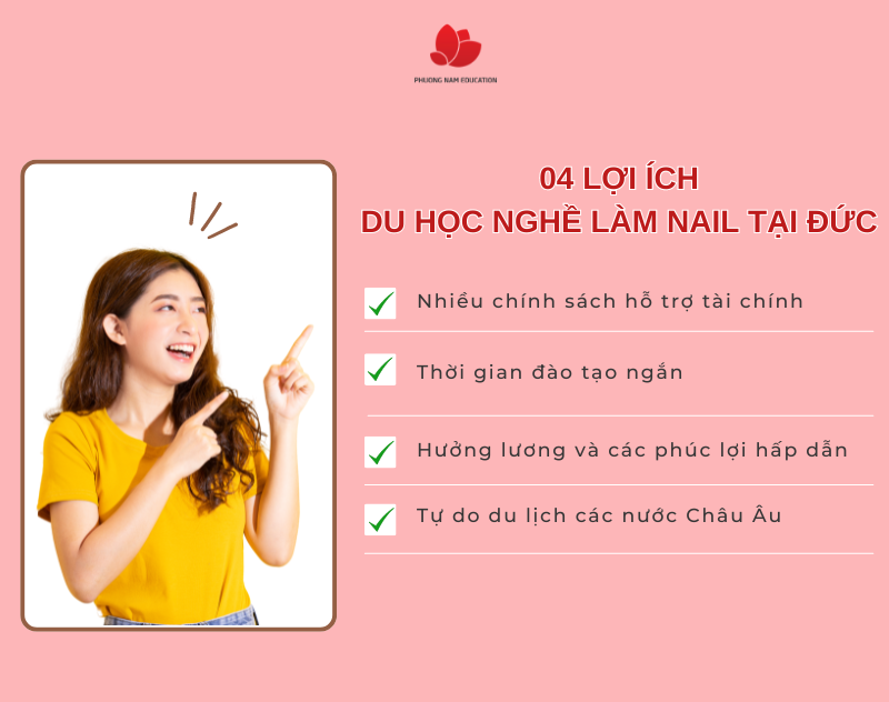 Du học nghề Nail ở Đức là cơ hội hấp dẫn dành cho các du học sinh bồi dưỡng kỹ năng chuyên môn và nâng cấp mức thu nhập của mình. Ngoài ra, khi đăng ký tham gia du học nghề tại Phuong Nam Education, các bạn sẽ còn được nhận thêm những lợi ích vượt trội khác như miễn 100% học phí, vừa học vừa làm hưởng lương, đảm bảo có việc làm ngay sau khi tốt nghiệp, cơ hội định cư và nhập tịch Đức, v.v.. Cùng tìm hiểu chi tiết hơn về chương trình tuyển sinh du học nghề làm Nail tại Đức.